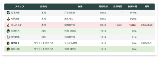 従業員ごとに、いま現在の勤務地・業務内容が一覧で表示されます。