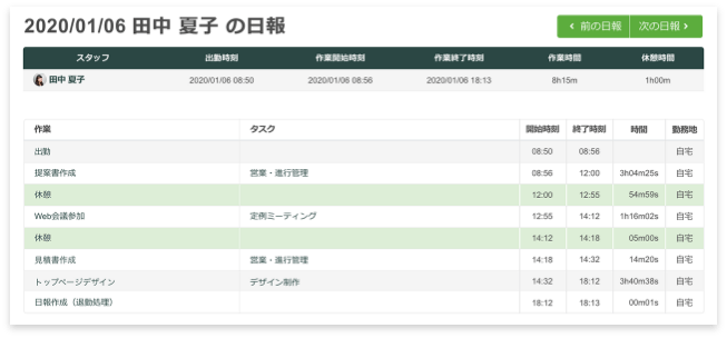 退勤時にワンクリックするだけで、出勤から退勤までの業務内容・作業時間が詳細に分かる日報を作成できます。